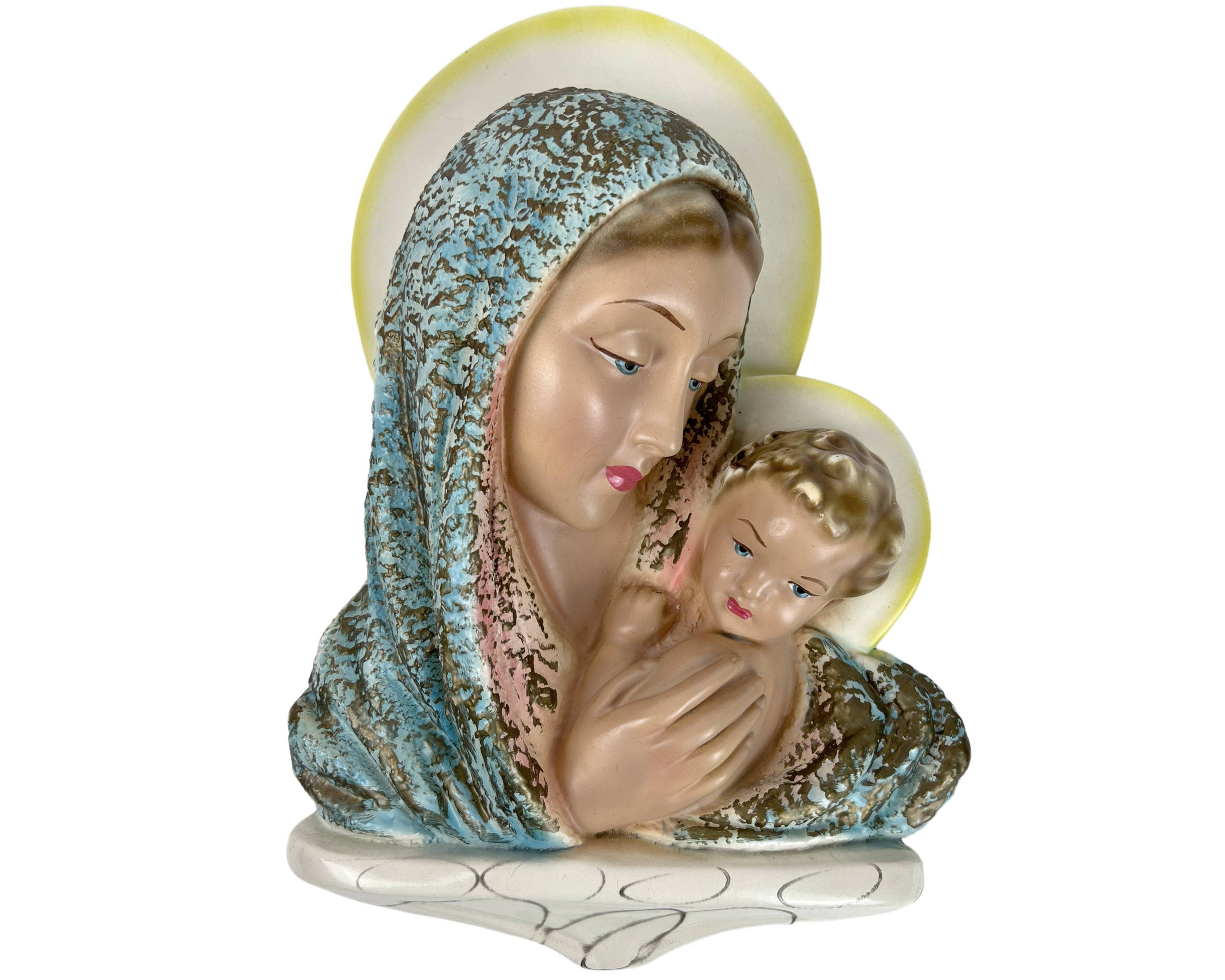 This is a vintage plaster wall hanging, aka chalkware, in the form of the Madonna holding Baby Jesus. The piece is handpainted and quite old - I would think that it dates to the 1950s, but possibly is a little older. The piece measures 14 high by 9 3/4 wide at its widest with a depth of 5. It is in very good condition with no chips or cracks - this is either a small repair or flaking to the bottom underside (see last close-up photo), but this is really minor. It has a metal hook affixed to the top that allows for hanging on a wall. This is wonderful vintage religious wall decor - lovely depiction of the Virgin Mother and Child..